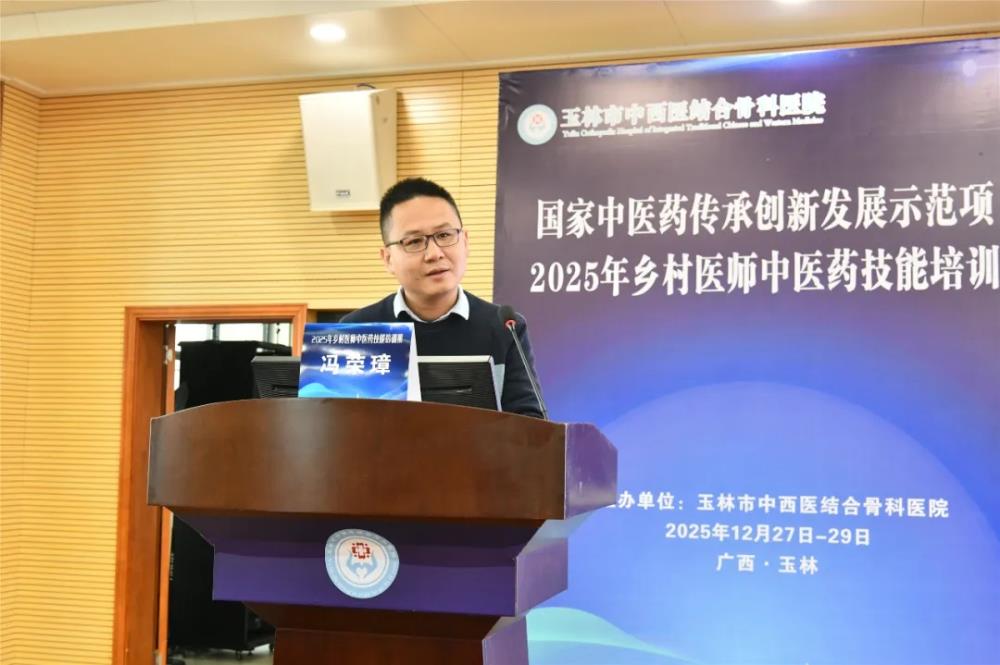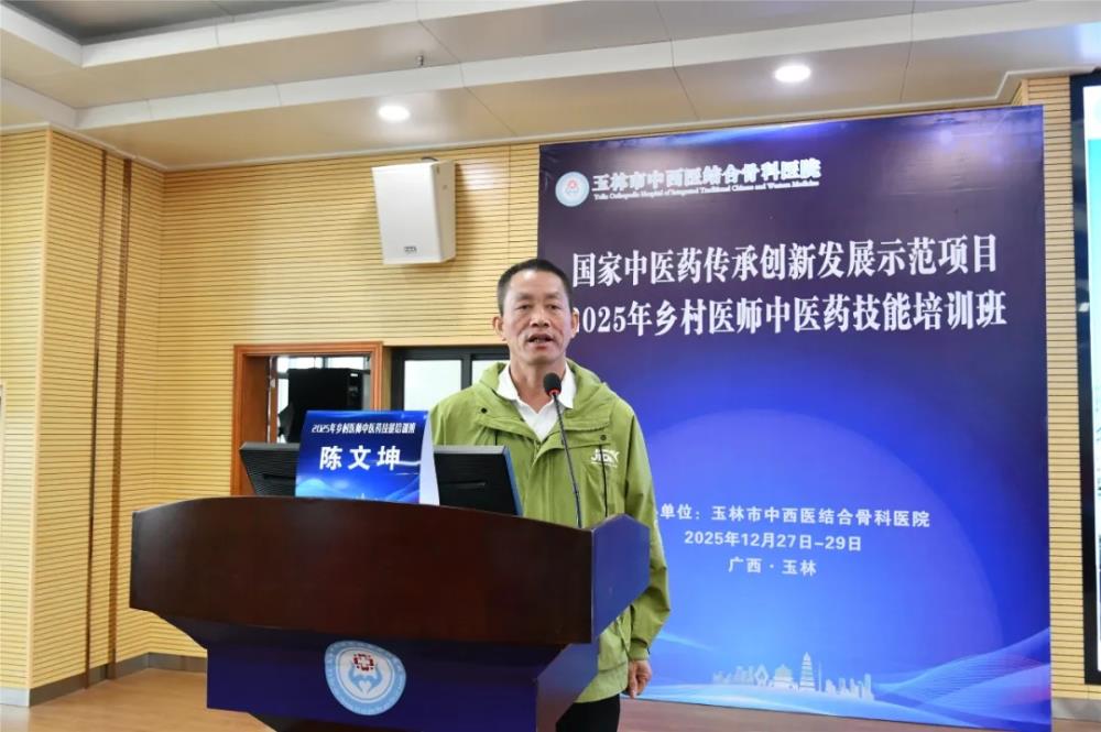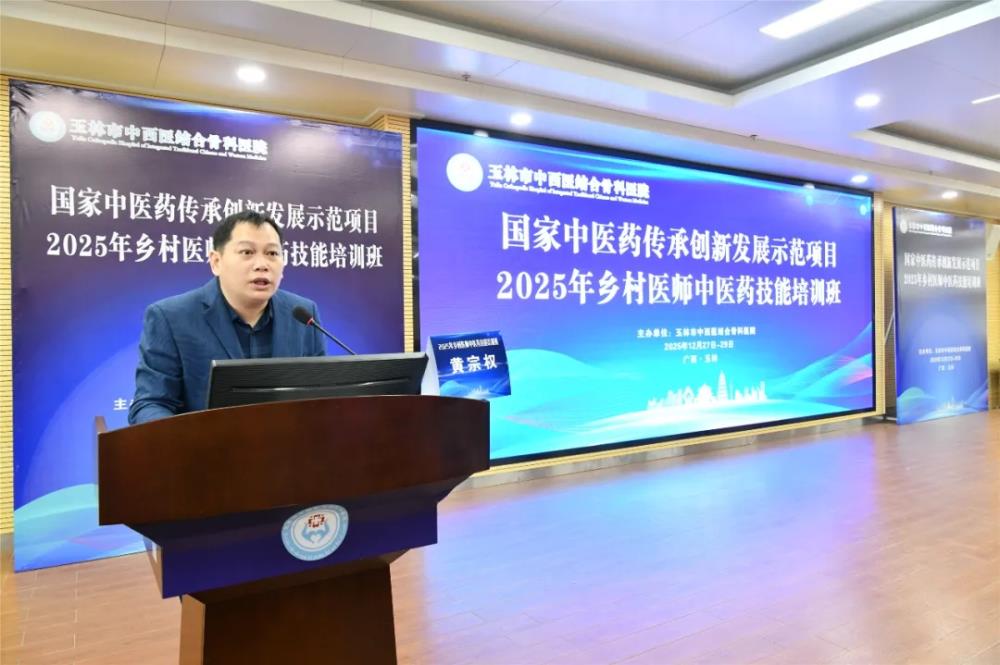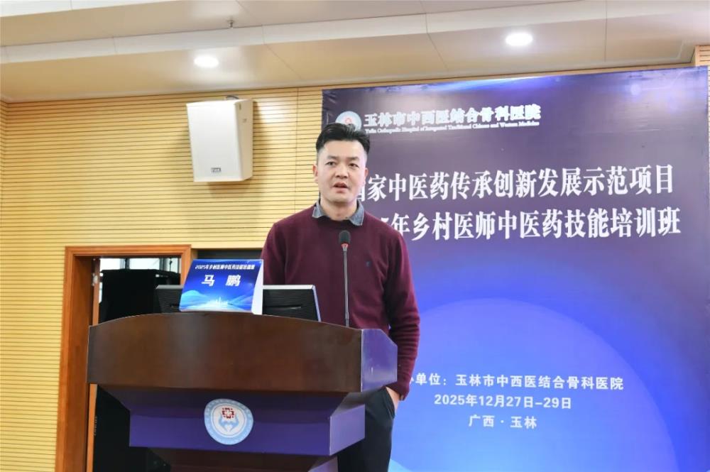 在12月28日上午的开班仪式由玉林市中西医结合骨科医院副院长黄宗权主持,他代表主办方对参训学员的到来表示热烈欢迎,并详细介绍了本次培训的背景、课程设置及组织安排。他指出,本次培训是玉林市中医药传承创新发展示范项目“基层中医药人才提升”子项目的重要实践,旨在通过标准化、规范化培训,破解基层乡村医师中医药技能薄弱难题,让“简、便、廉、验”的中医药技术更好地服务乡村百姓。同时还着重强调了培训纪律要求,要求学员严格遵守中央八项规定精神及培训管理制度,珍惜学习机会,做到学以致用。