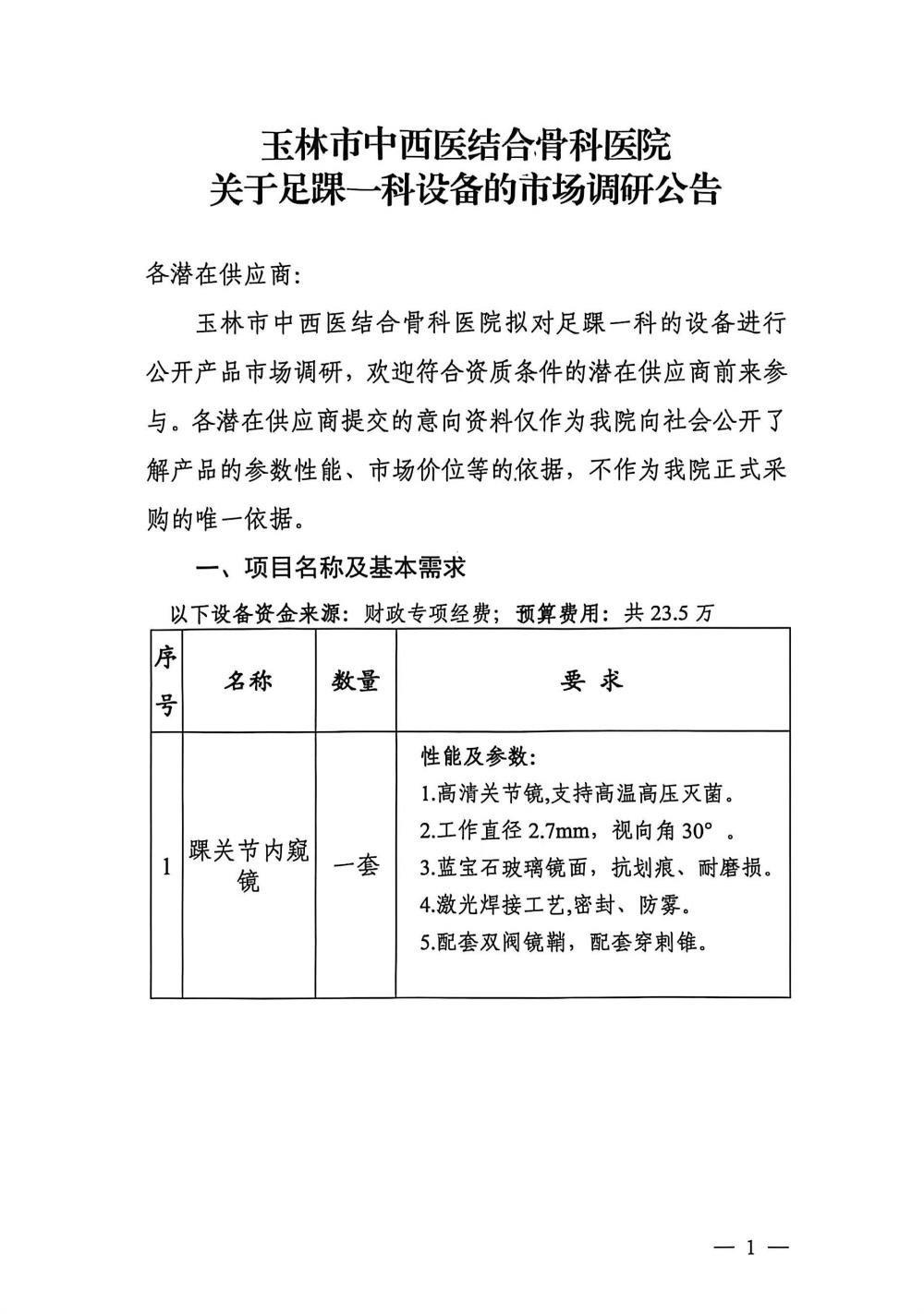 玉林市中西医结合骨科医院关于足踝一科设备的市场调研公告