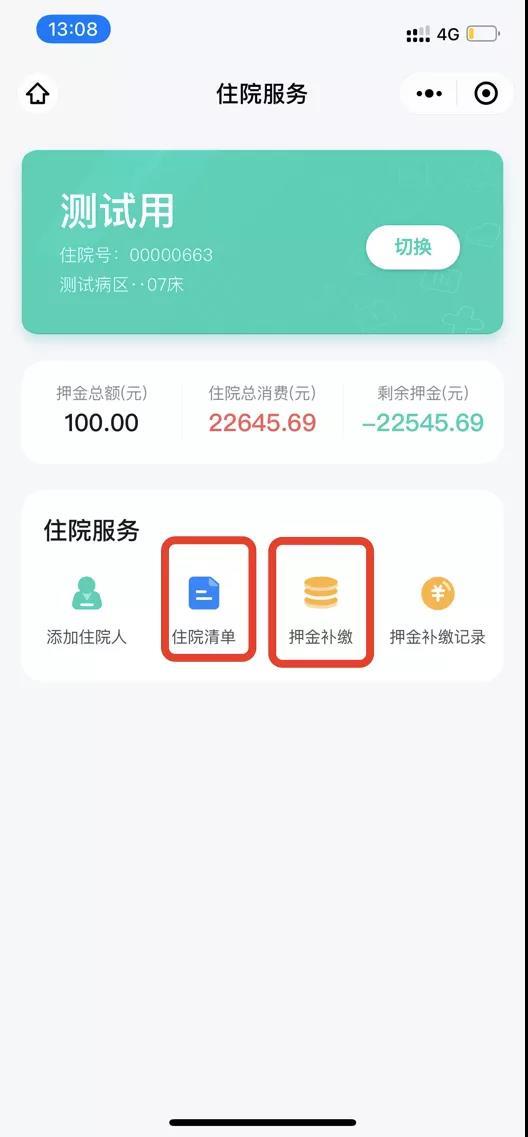 (3)点击“押金补缴”可以交押金。(4)点击“住院清单”可查看住院日每日清单明细