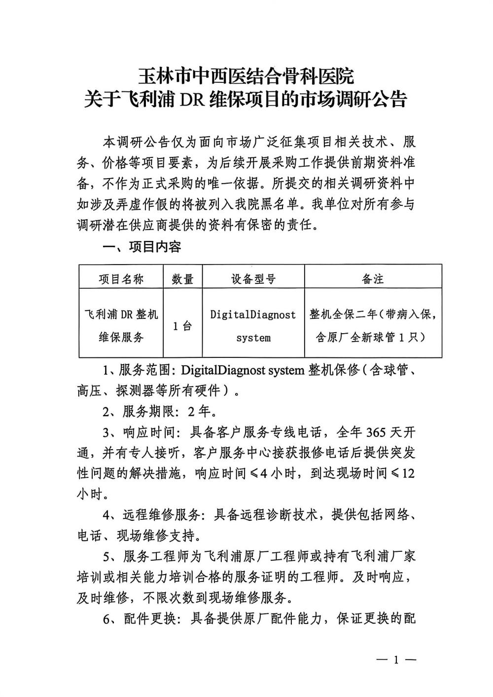 玉林市中西医结合骨科医院关于飞利浦DR维保项目的市场调研公告