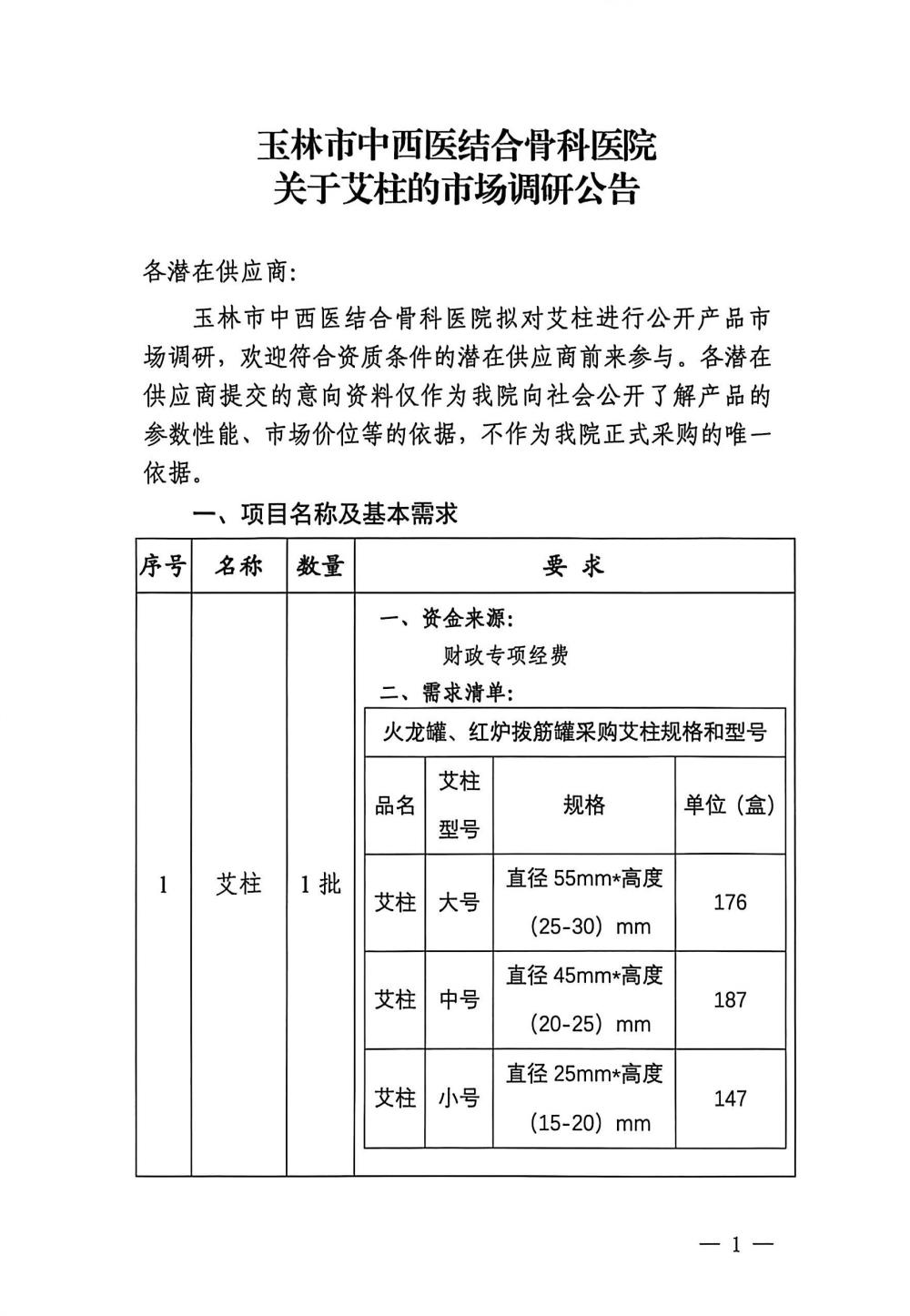 玉林市中西医结合骨科医院关于艾柱的市场调研公告