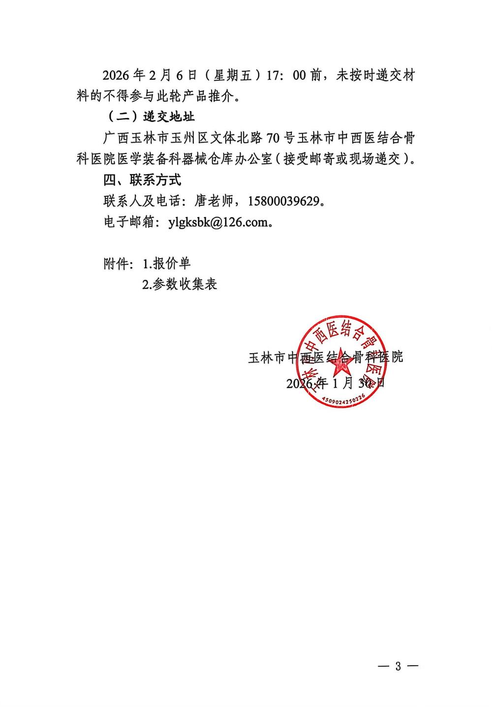 玉林市中西医结合骨科医院关于综合外科设备(二)的市场调研公告
