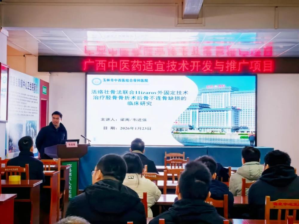 在学术讲座环节,专家们带来了紧密贴合基层需求的专题分享。韦进强副主任医师围绕《活络壮骨法联合Ilizarov外固定技术治疗胫骨骨折术后骨不连骨缺损的临床研究》开展适宜技术推广;庞家省主任讲解了《骨髓炎长段骨缺损的治疗》与《人工髋关节置换术后感染翻修》;杜俊毅主任分享了《“三针一体”平衡诊疗体系的创立与实践》。讲座内容深入浅出,实用性强,随后还进行了中医治疗操作教学展示,为基层医务人员拓宽了专业视野,输送了新技术、新理念。