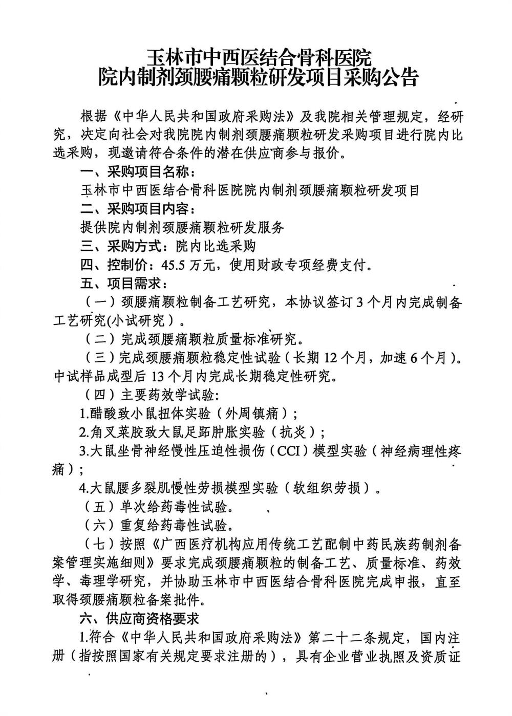 玉林市中西医结合骨科医院院内制剂颈腰痛颗粒研发项目采购公告