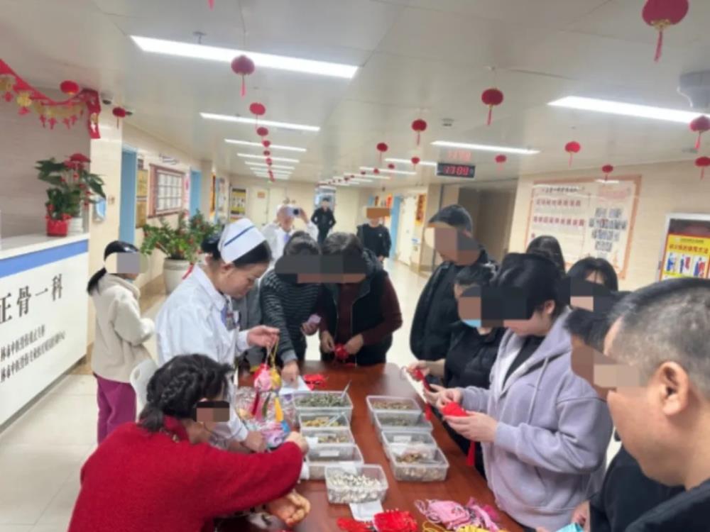为给科室营造喜庆祥和的新春氛围,护士团队提前着手对病房走廊进行了精心布置。一盏盏红彤彤的灯笼整齐悬挂,一抹抹中国红点缀着整个走廊,原本静谧的病房瞬间被新春的暖意包裹,驱散了冬日的寒凉与病痛的阴霾。路过的患者及家属纷纷驻足,看着喜庆的灯笼,脸上露出了久违的笑容,一句句“有年味了”“像在家一样”,便是对护士团队最真挚的肯定。在护士的细致讲解下,患者及家属们纷纷动手投入到香囊制作中,欢声笑语不断回荡在病房中。