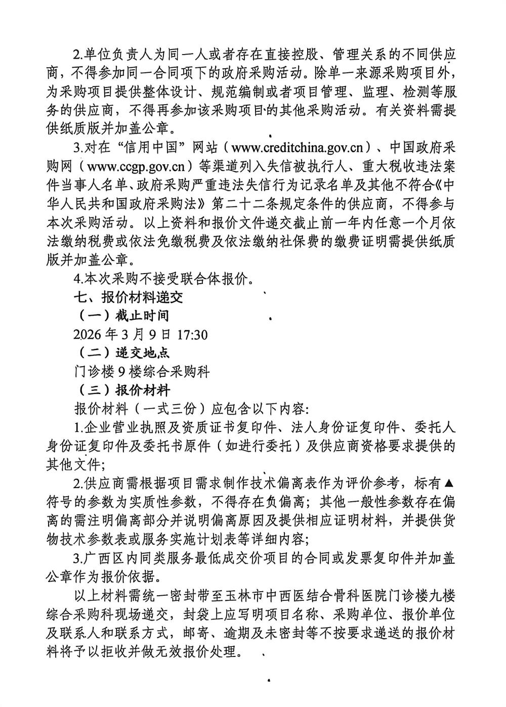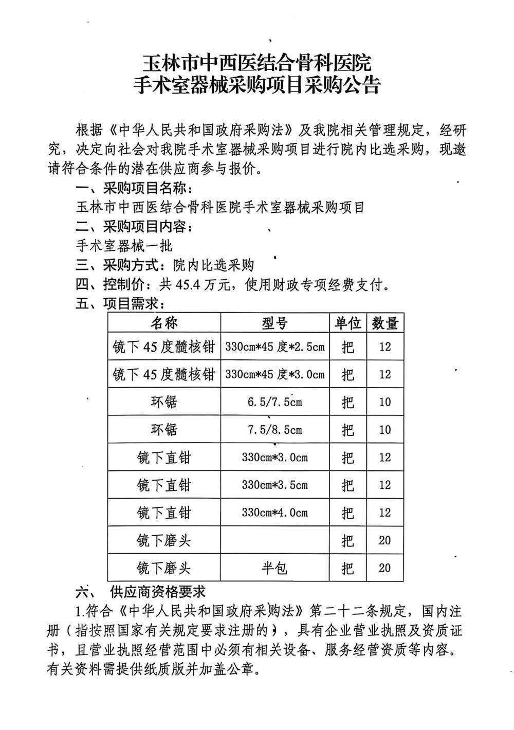 玉林市中西医结合骨科医院手术室器械采购项目采购公告