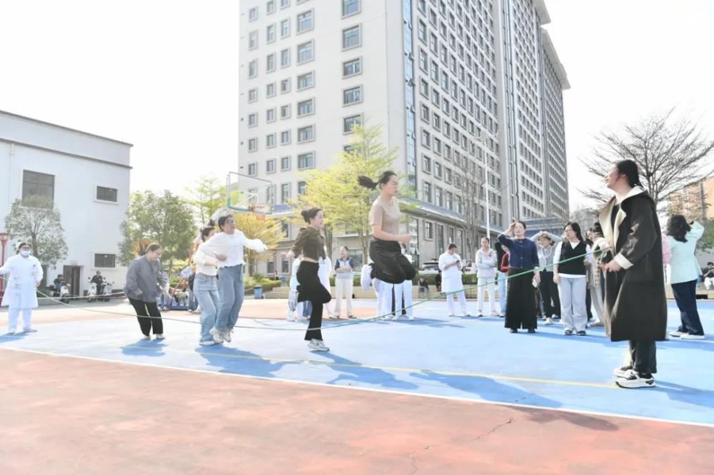 此次集体跳绳活动以“快乐运动、凝聚力量、绽放风采”为核心主题,兼顾趣味性与竞技性,又考验团队协作能力,让大家在运动中放松身心、增进情谊。活动现场,活力满满。平日里身着白大褂、坚守诊疗一线的女职工们,暂时卸下工作的严谨与忙碌,精神饱满地奔赴赛场,化身活力四射的“运动达人”。一根根跳绳在空中飞速旋转,划出一道道优美的弧线,参赛女职工们轻盈起跳、灵活穿梭,脚尖点地如蜻蜓掠水,跳绳甩动的“呼呼”声、现场的加油声、欢呼声交织在一起,汇成一曲欢乐的春日乐章,充分展现了医疗女职工别样的巾帼风貌。每一次跳跃都彰显着拼搏进取的精神,每一滴汗水都闪耀着青春活力,队员们分工明确、默契配合,摇绳人员稳健发力,跳绳人员有序衔接,大家心往一处想、劲往一处使,在协作中凝聚力量,在比拼中收获快乐,将团队的凝聚力与向心力展现得淋漓尽致,充分诠释了“团结就是力量”的深刻内涵。