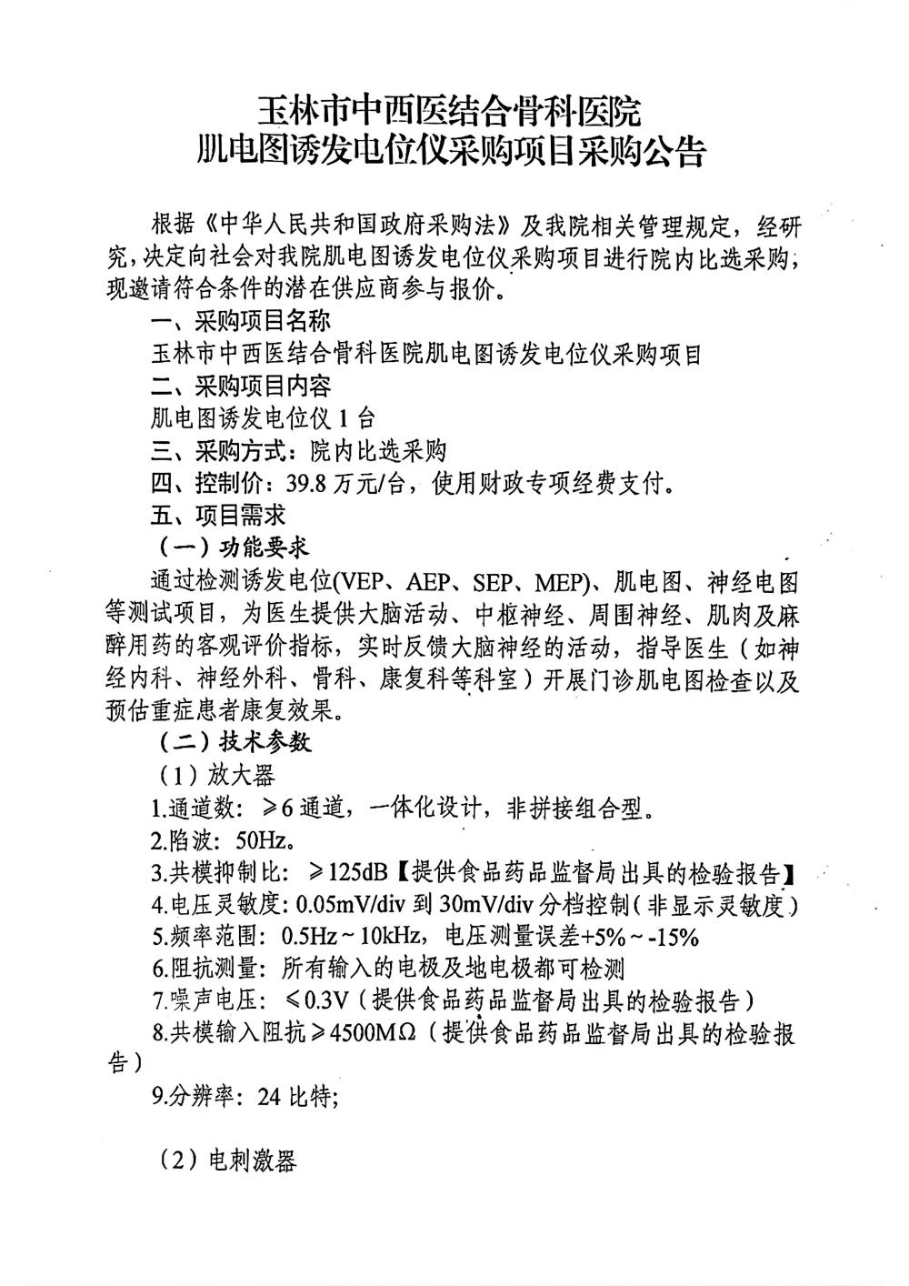 玉林市中西医结合骨科医院肌电图诱发电位仪采购项目采购公告