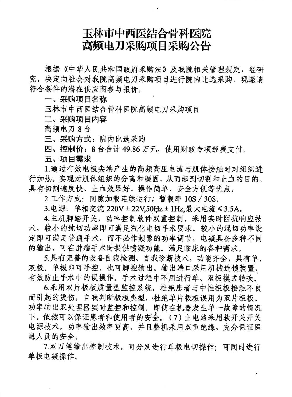 玉林市中西医结合骨科医院高频电刀采购项目采购公告