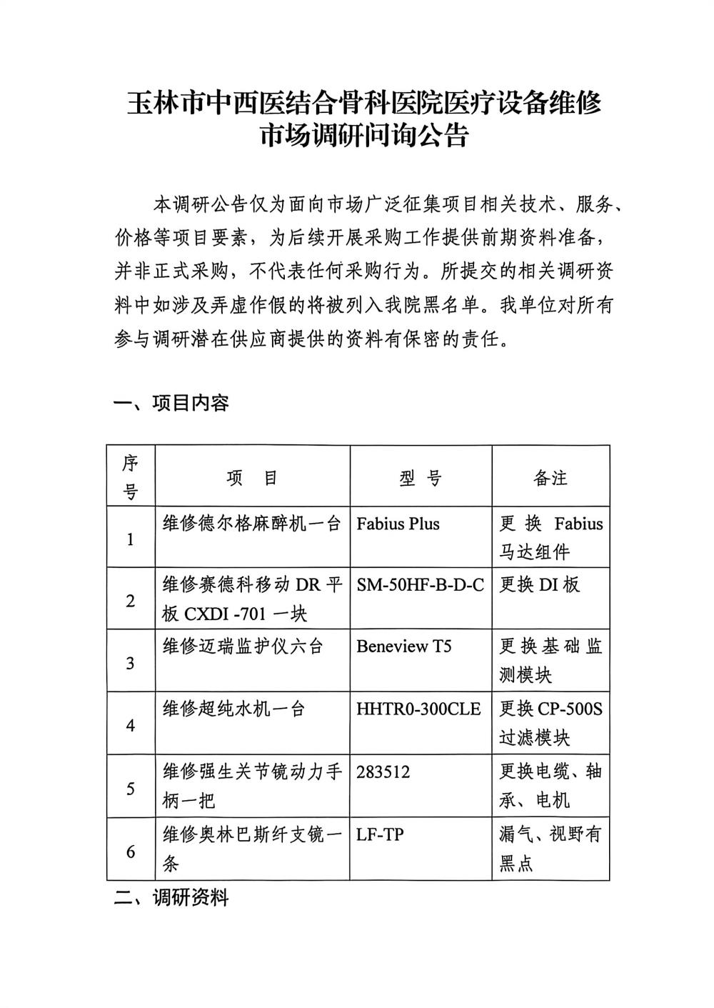 玉林市中西医结合骨科医院医疗设备维修市场调研问询公告