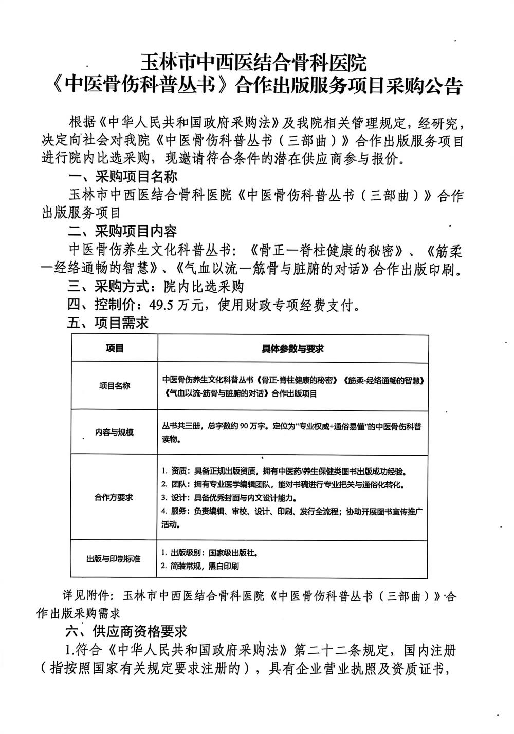 玉林市中西医结合骨科医院《中医骨伤科普丛书》合作出版服务项目采购公告