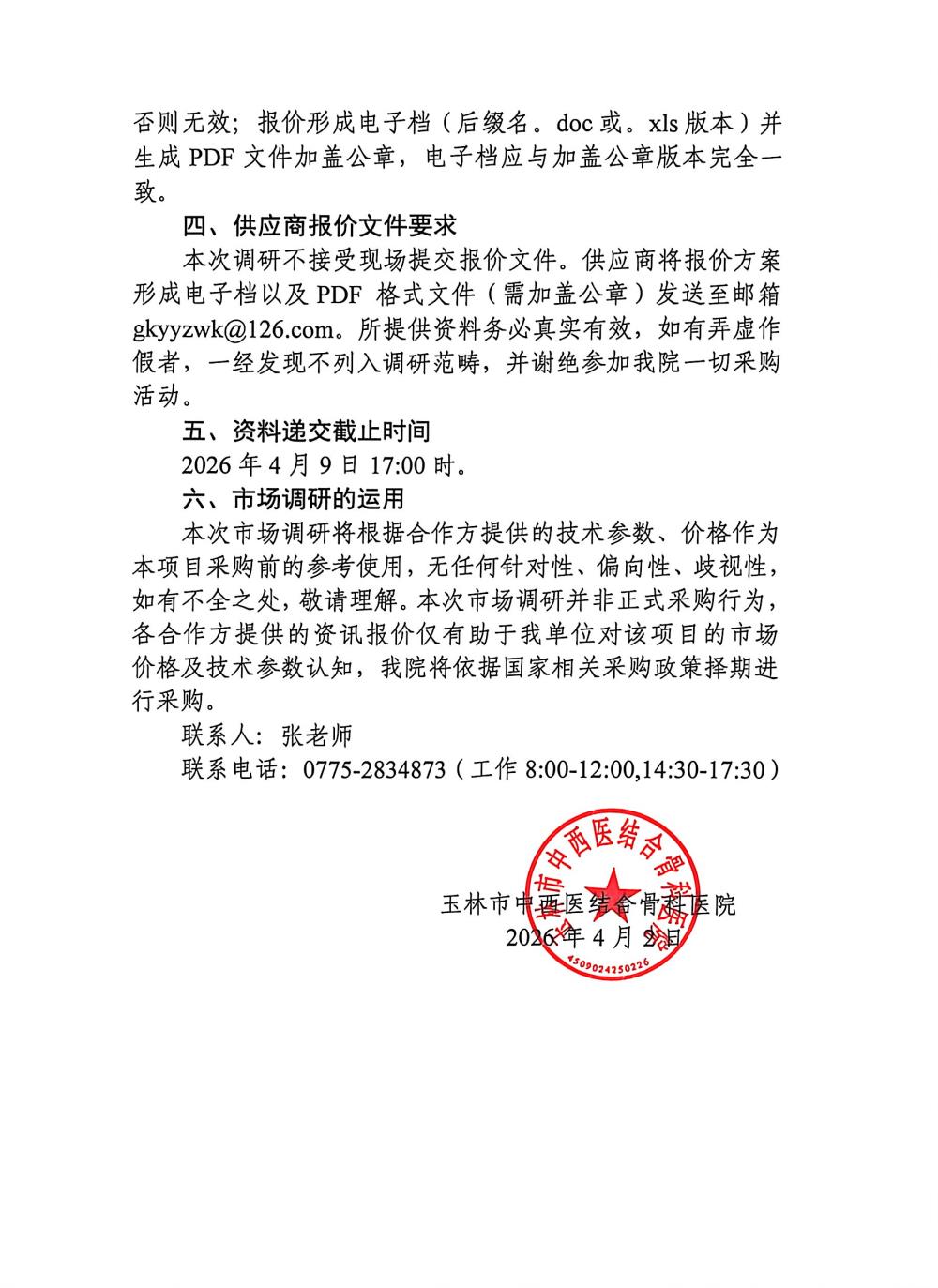 玉林市中西医结合骨科医院专业训练专用装备及器材采购项目市场调研公告