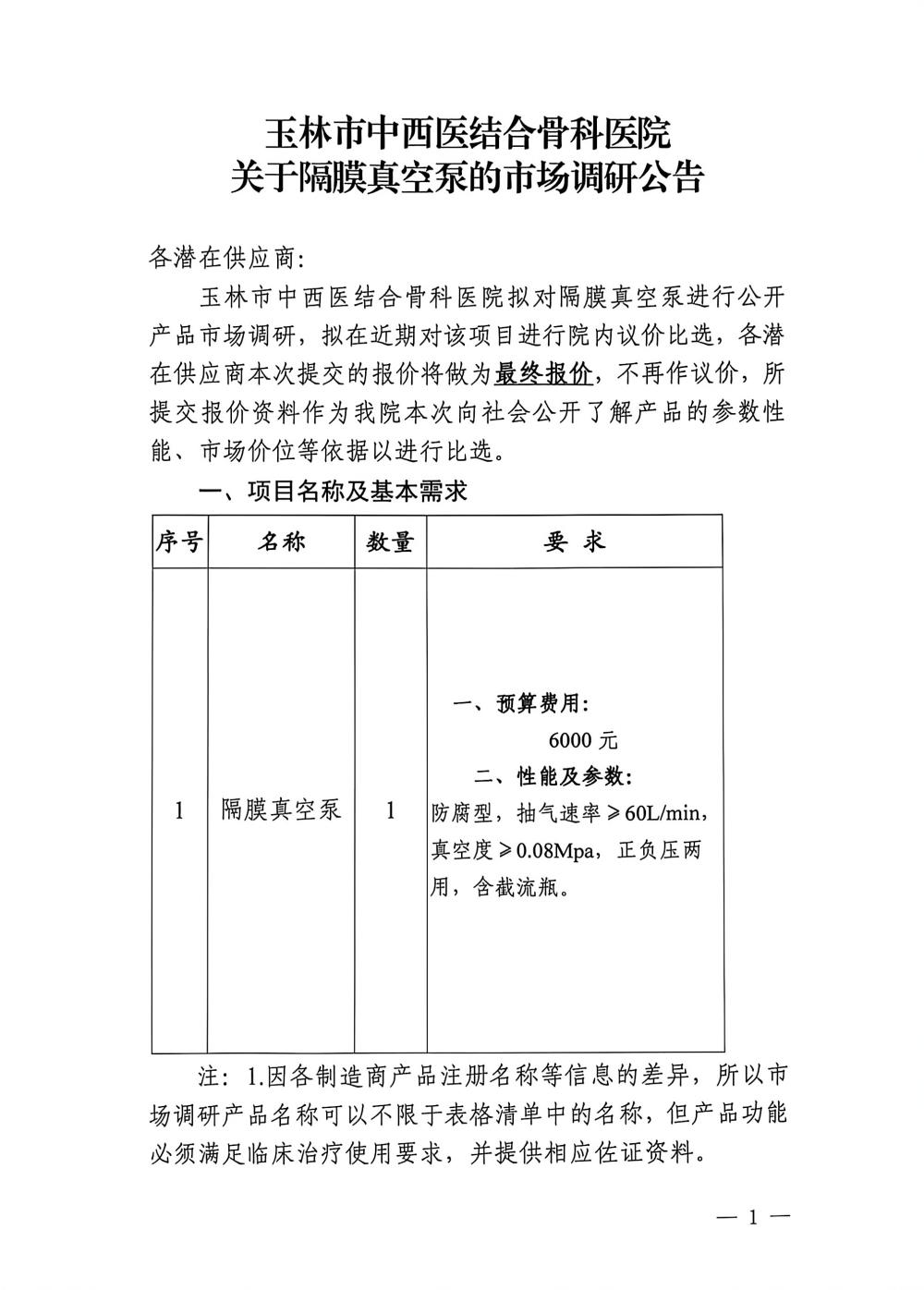 玉林市中西医结合骨科医院关于隔膜真空泵的市场调研公告