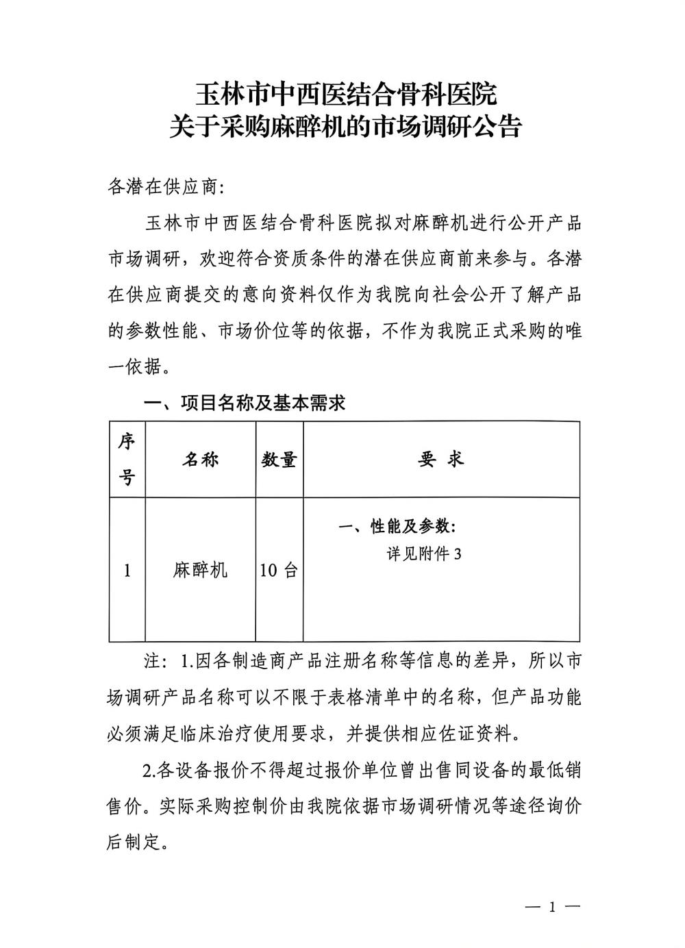 玉林市中西医结合骨科医院关于采购麻醉机的市场调研公告