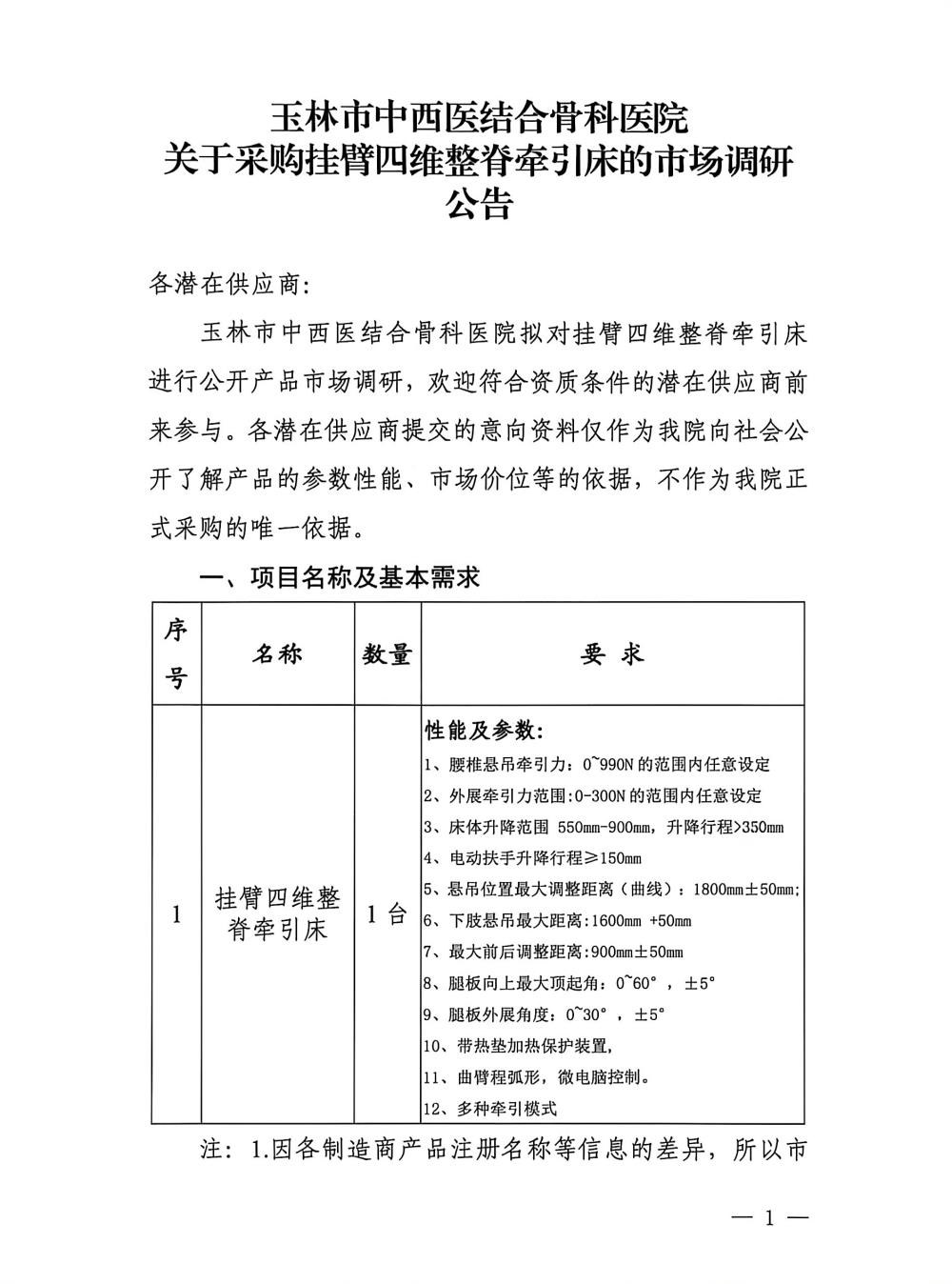 玉林市中西医结合骨科医院关于采购挂臂四维整脊牵引床的市场调研公告