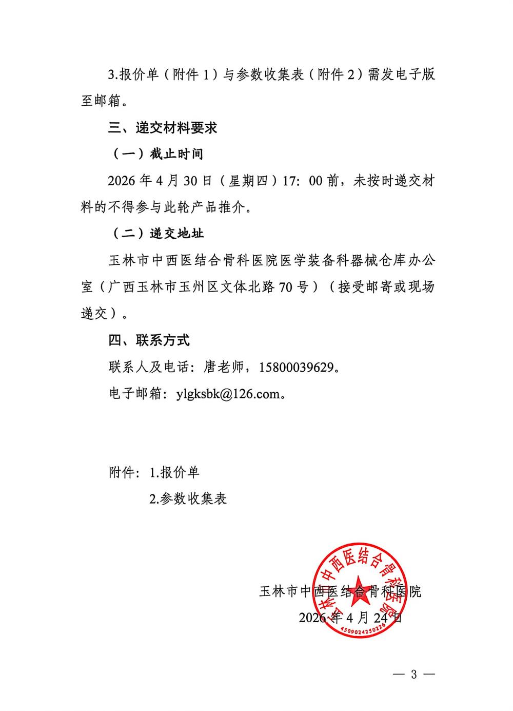 玉林市中西医结合骨科医院医疗设备维修市场调研问询公告
