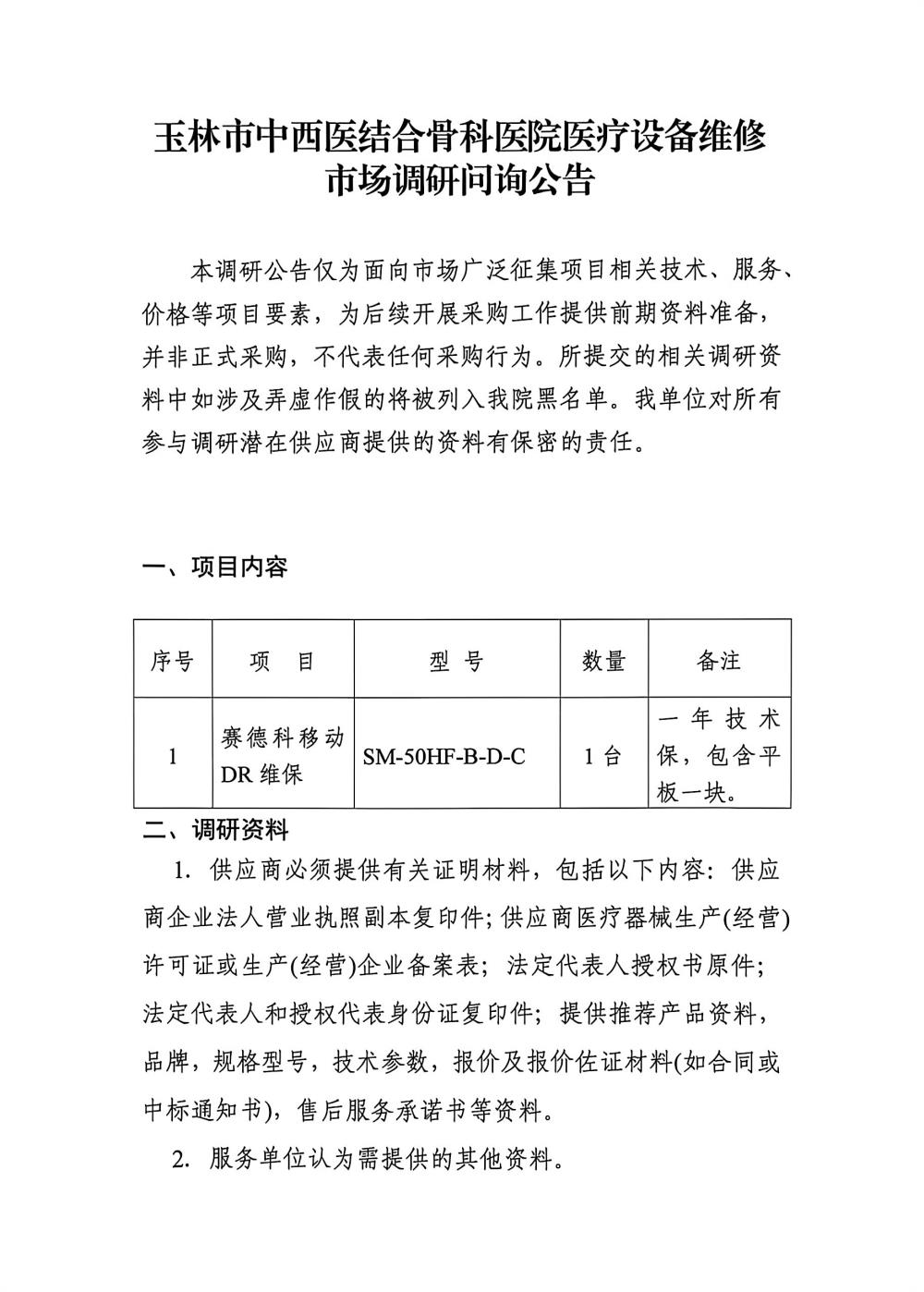 玉林市中西医结合骨科医院医疗设备维修市场调研问询公告