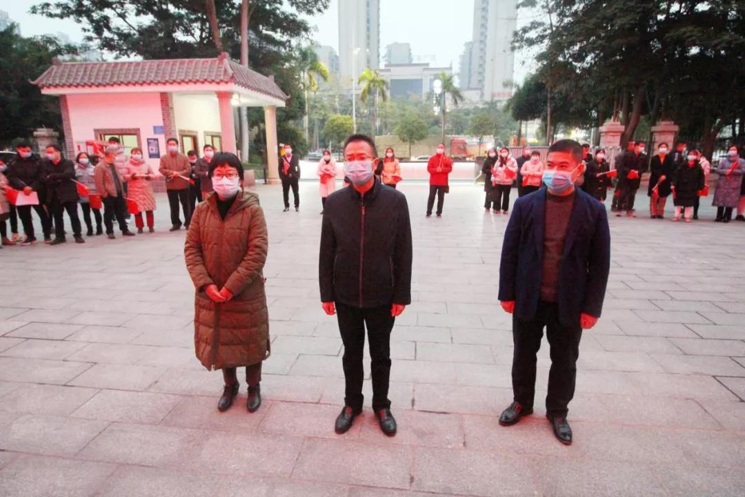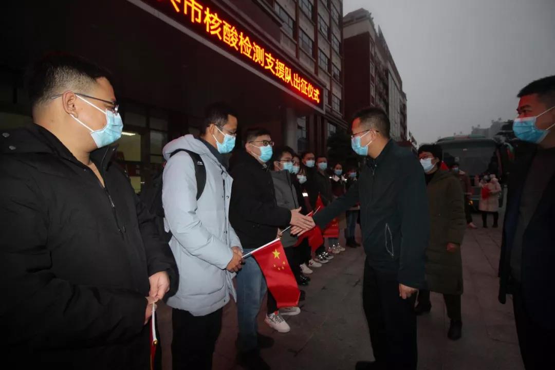 ◆玉林市政府副市长马少华(中)玉林市卫生健康委员会副主任、党组成员杨媚(左一)玉林市卫生健康委员会纪检组长李坚(右一)对核酸检测应急出征队员寄语