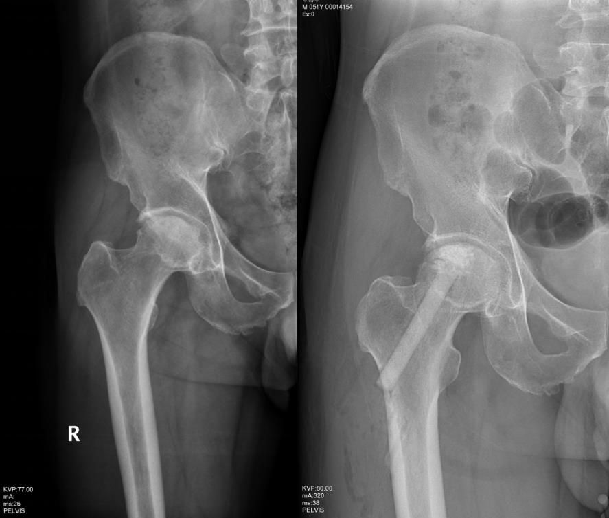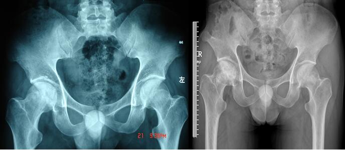 微创病灶清除陶瓷棒植入诱导血管重建治疗股骨头坏死,图为术前术后照片。