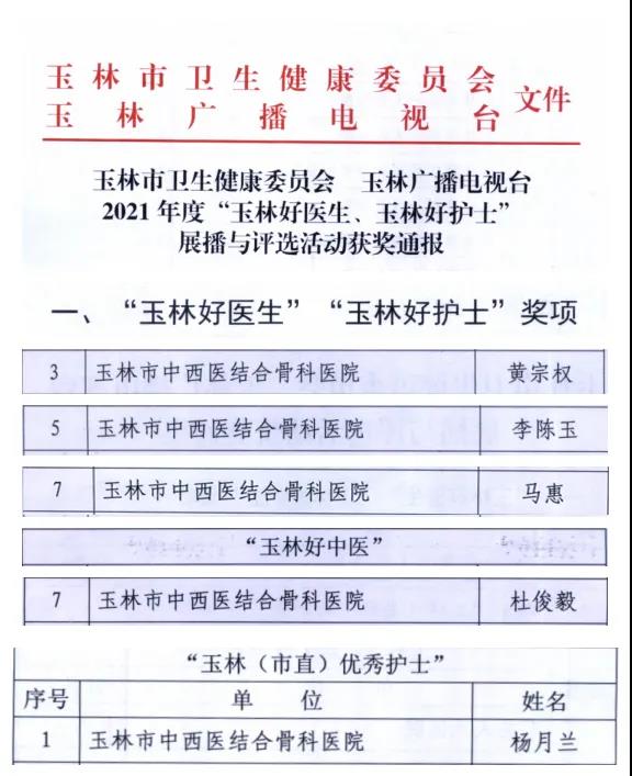 喜报!热烈祝贺玉林市中西医结合骨科医院医护人员获选2021年度“玉林好医生、玉林好护士”称号
