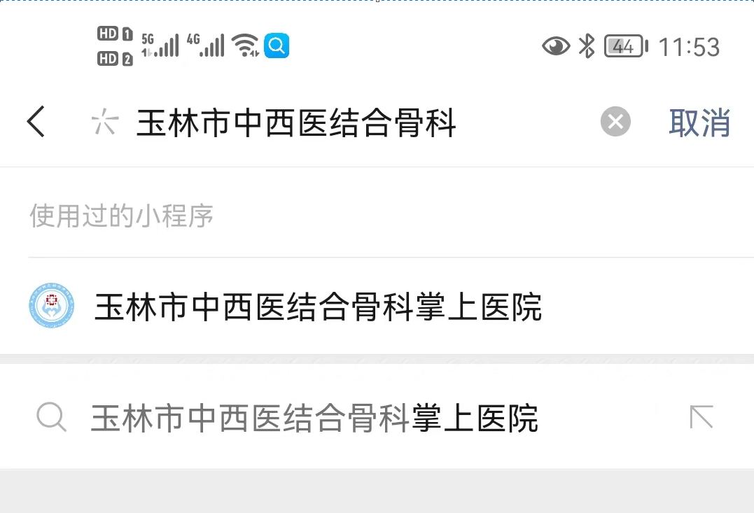 一、在微信搜索小程序的搜索栏里面输入:玉林市中西医结合骨科掌上医院,或搜索公众号:玉林市中西医结合骨科医院,点击进入掌上医院。