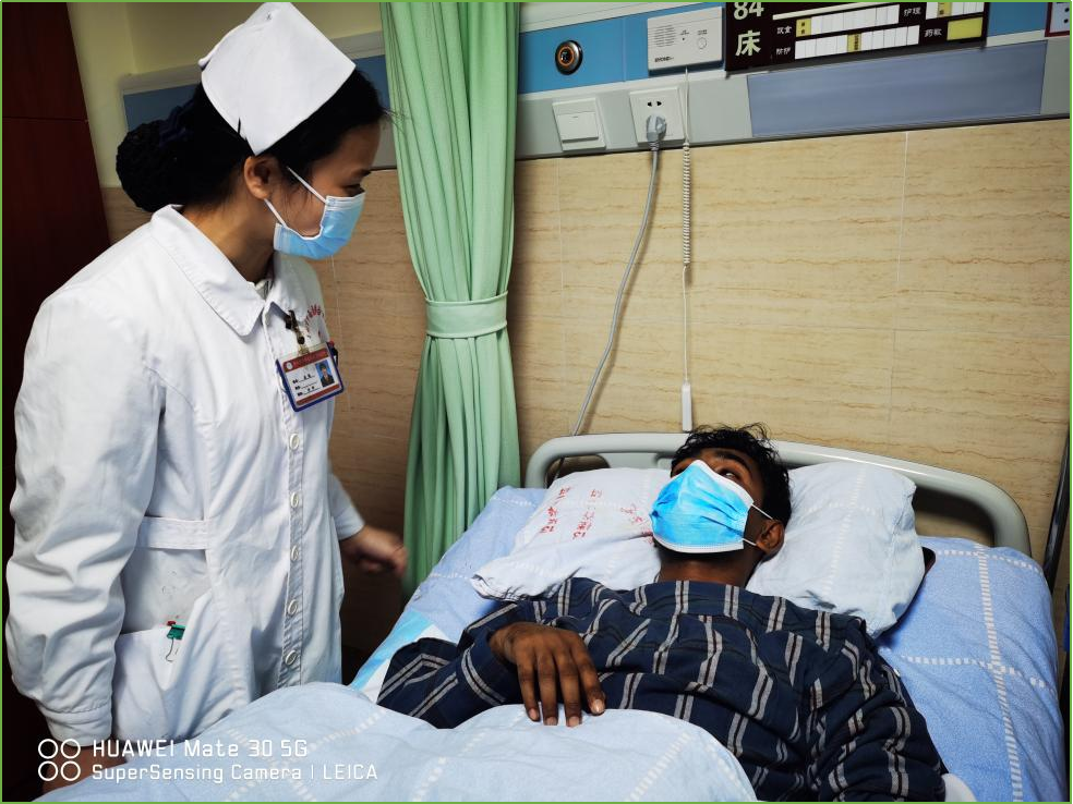 这不,莫阿姨身体恢复好了,又把腰痛半年之久的女婿带来了。莫阿姨的女婿来自孟加拉国,对中文掌握还不是很熟练,于是脊柱一科唐护士和医生便用娴熟的英语与其沟通治疗方案,术后唐护士又耐心指导患者进行康复训练。目前患者腰痛症状缓解,治疗效果好,出院前莫阿姨和其女婿对脊柱一科医务人员的精湛医术和周到细致的服务表示衷心感谢。