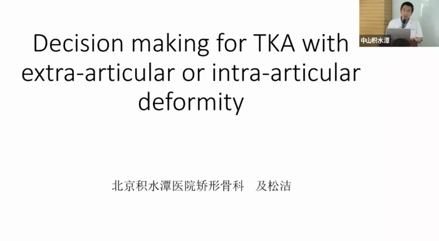 中山积水潭骨科医院矫形科主任、北京积水潭医院副主任医师及松洁教授讲解《Decison marking for TKA with extra-articular or intra-articular deformity》。及松洁教授通过一例HTO术后畸形引出本次讲课主题,首先介绍了下肢生物力学特点、膝关节解剖、CORA点的ZoneI-III区,并通过大量下肢畸形病例分别分析了I-III区不同内外翻畸形的手术方法,最后总结三个原则:axis、balance、CORA。
