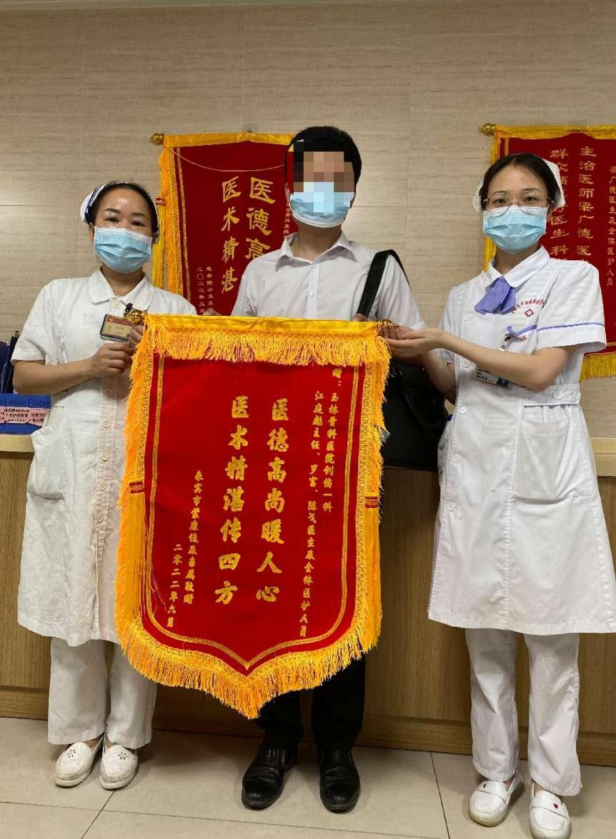 “不是亲人,胜似亲人”,患者蒙先生说,“伤病是痛苦的,但是你们对待病人的责任感,对待工作的认真负责,令我感动和钦佩”。2022年6月,玉林市中西医结合骨科医院创伤一科患者蒙先生将一面印有“医德高尚暖人心,医术精湛传四方”字样的锦旗,送到我院创伤一科,感谢江庭彪主任的悉心救治以及全科医护人员的精心护理。
