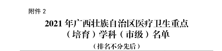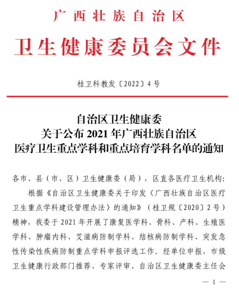 近日,在自治区卫生健康委发布关于公布2021年广西壮族自治区医疗卫生重点学科和重点培育学科名单中,我院骨科在众多佼佼者中脱颖而出,成功入选省级重点培育学科名单。