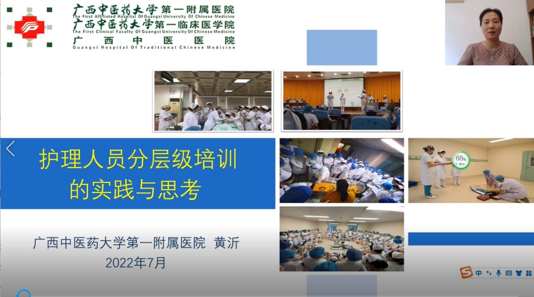 (广西中医护理质控中心主任、广西中医药大学第一附属医院护理部主任黄沂教授线上授课《护理人员分层级培训的时间与思考》),她围绕临床护理教学、考试培训及临床实践等方面,深入探讨了护理人才培养、护士队伍建设的实践与思考。
