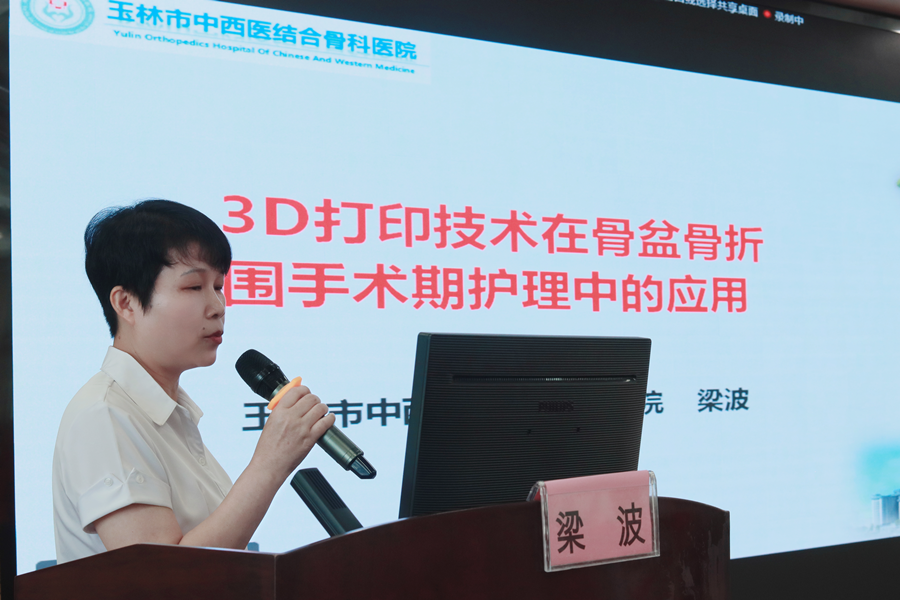 ▲玉林市护理学会骨科和康复护理专业委员会主任委员、我院护理部主任梁波副主任护师授课《3D打印技术指导在骨盆骨折围手术期的应用》