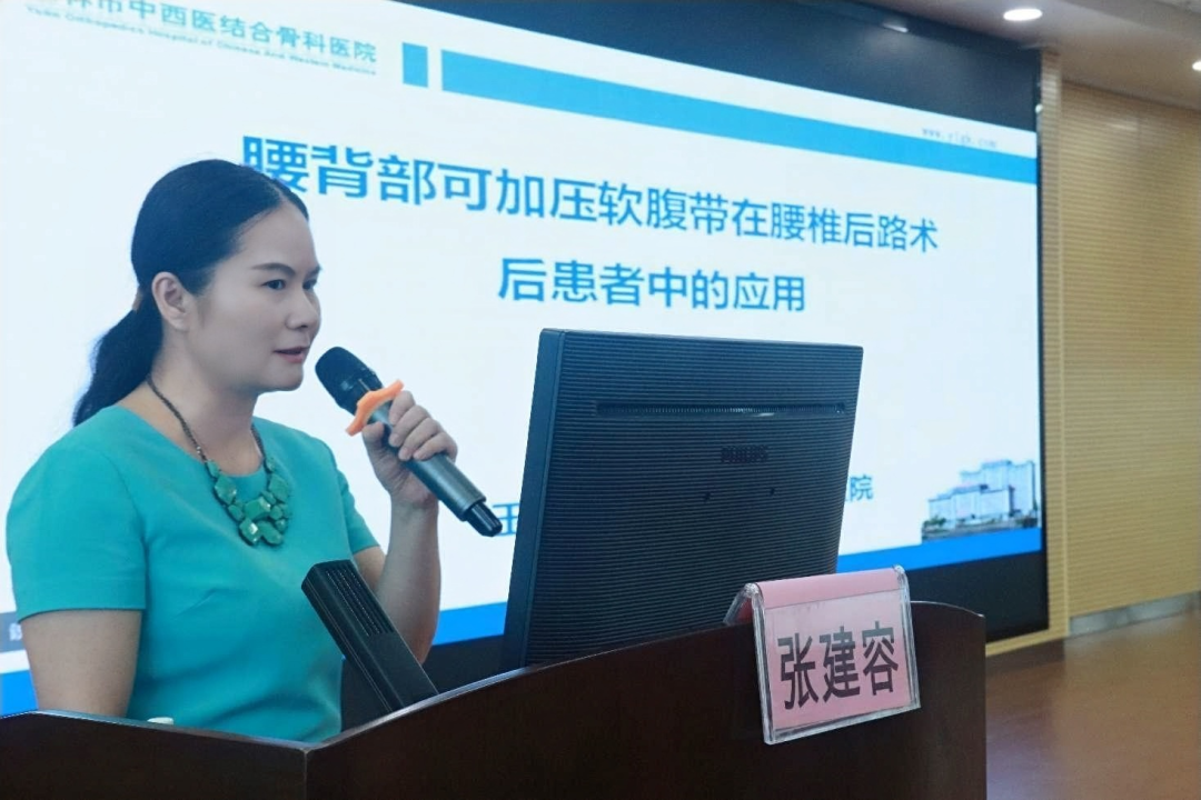 ▲我院脊柱一科护士长张建容副主任护师授课《腰背部可加压软腹带在腰椎后路术后患者中的应用》