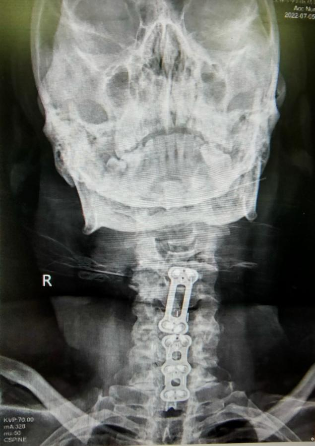 近日,玉林市中西医结合骨科医院脊柱二科收治了一位颈脊髓损伤的患者,病人刚入院的时候四肢无力,大小便失禁,情况不容乐观。患者陈先生,2022年6月30日下午,在二环西路骑车不小心摔伤,头部先着地,颈部和头部受伤,受伤后短暂昏迷,后面自己苏醒过来。醒来后虽然没有再次昏迷和记忆混乱受损的情况,但是四肢却疼痛麻木,没办法动弹。之后被送往就近医院进行治疗,可是效果不佳,仍旧没办法活动。为了更好的治疗,果断选择转院到玉林市中西医结合骨科医院。入院后,我院医护人员马上对陈先生进行相关检查,诊断出陈大哥目前病症情况:无骨折脱位型颈脊髓损伤(过伸性损伤)、高位截瘫、脊髓型颈椎病、高血压病、糖尿病。 时间紧迫,分秒必争,经过脊柱二科团队讨论研究,决定马上行颈前超路减压植骨融合钛板内固定术、椎管扩大、神经根松懈术手术,手术很顺利。陈先生原本四肢均不可活动,急诊手术后,双下肢可以活动,肌力恢复至3级,现在已经可以自解大小便了。