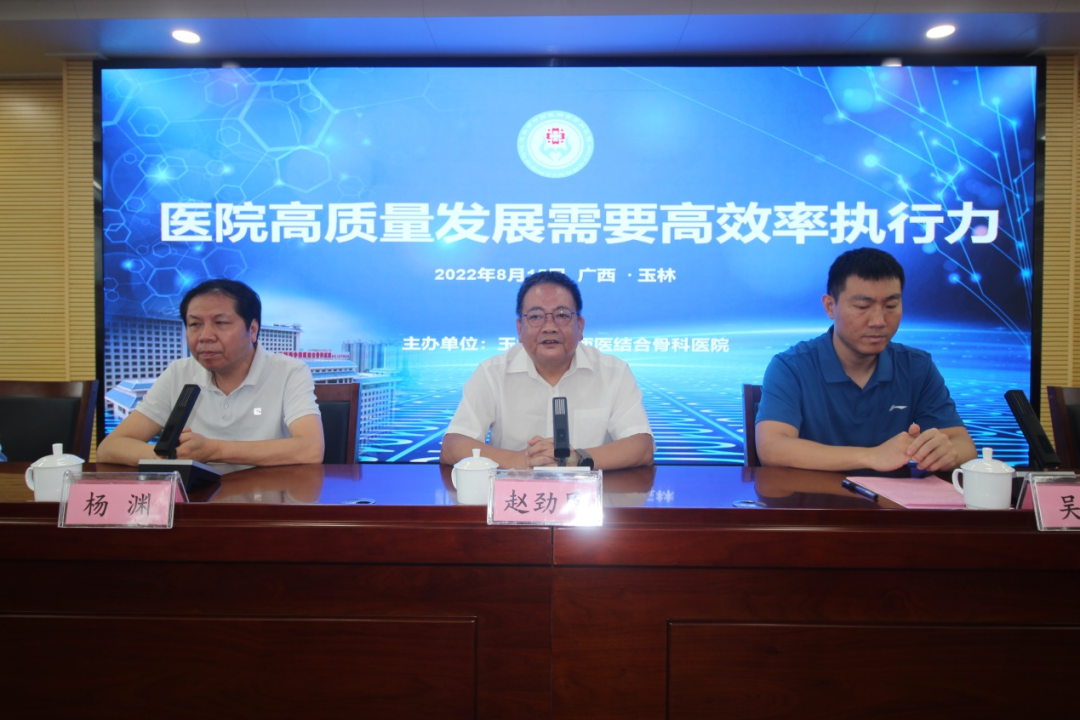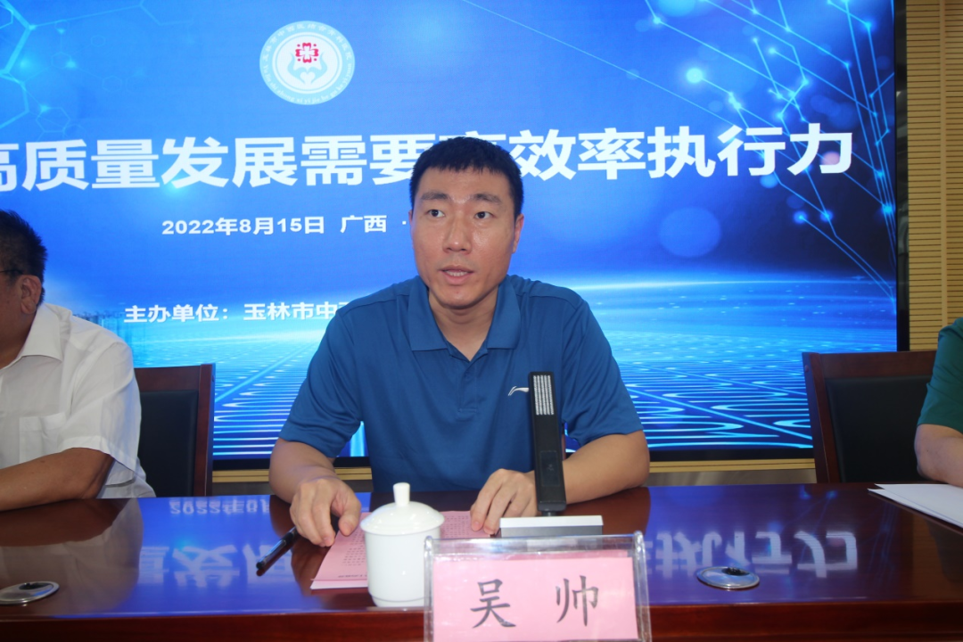 吴帅主任强调,医院管理服务效率和执行力,是贯彻落实医院科学发展、构建和谐医院的重要内容之一,也是创建群众放心满意医院的关键;赵劲民校长亲临玉林授课,是对玉林市中西医结合骨科医院和玉林市卫生健康事业发展的大力支持。吴主任希望参会的各医院领导和中层骨干认真学习,吸收好的管理经验与方法,从而推动我市卫生健康事业高质量发展,惠及更多老百姓。