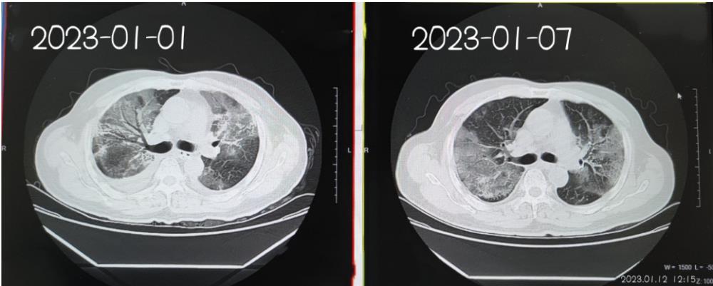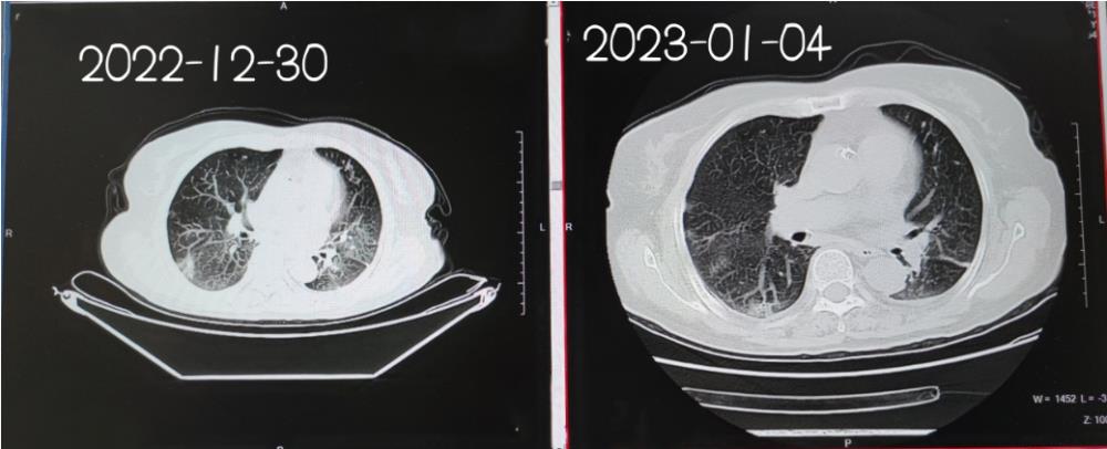 图为治疗前后肺部CT对比图,病灶明显减少,中医药干预在有效改善临床症状及缩短病程中起到至关重要的作用
