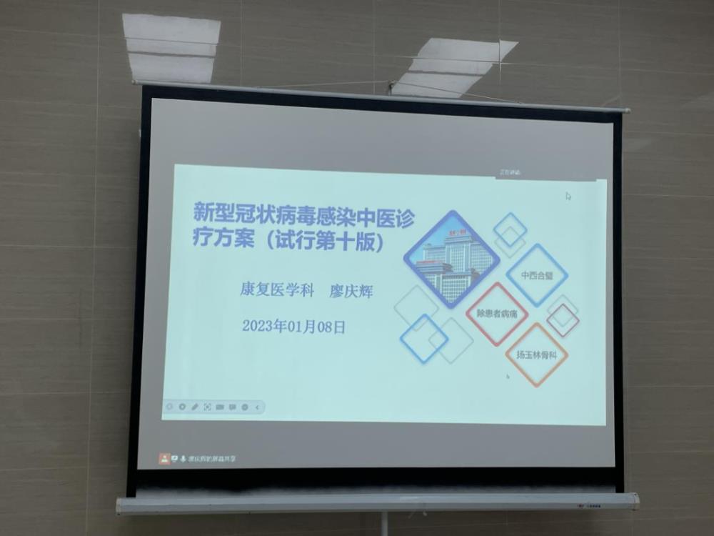 2023年1月9日,玉林市中西医结合骨科医院医务科、教务科组织通过线上直播的方式开展了《新型冠状病毒感染诊疗方案(试行第十版》主题培训。全院医护人员、进修学员、规培学员、实习生参加培训。会议由医务科梁周科长主持。