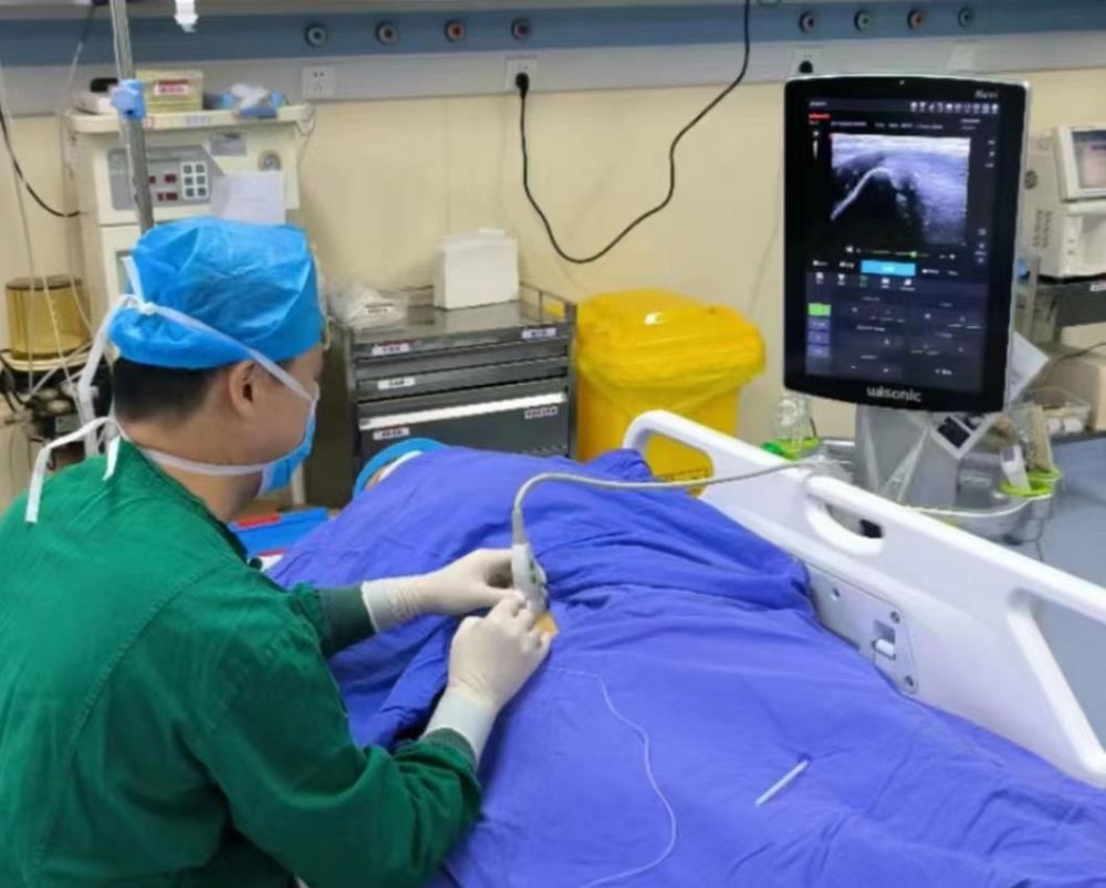 ▲“麻仔”在为病人先行实施髂筋膜神经阻滞,让病人从容面对后面的搬动、翻身