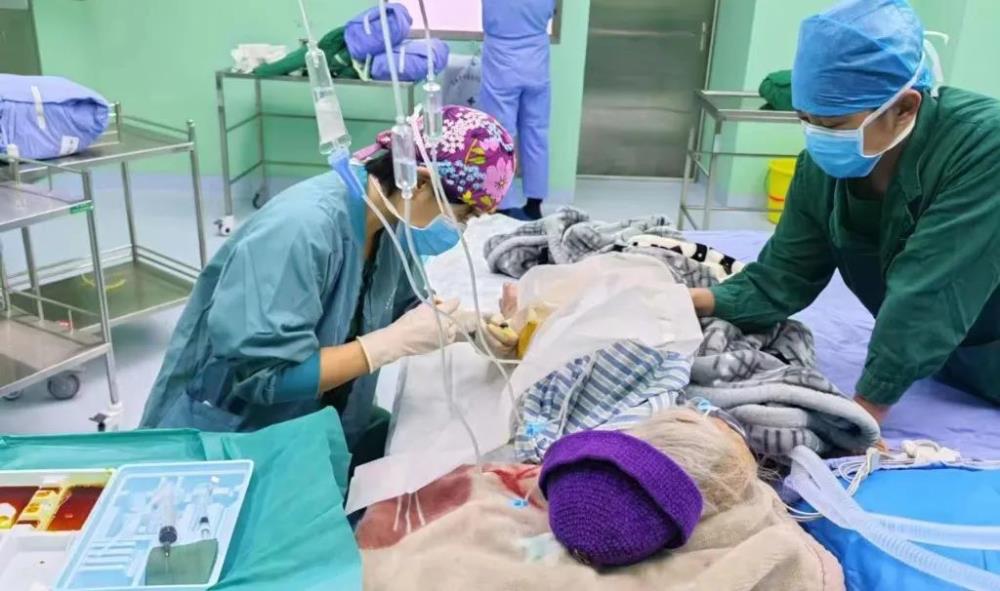 ▲“麻花”在给112岁股骨颈骨折病人实施椎管内麻醉,实施神经阻滞后,病人能很好的配合侧身置于实施椎管内麻醉的标准体位,提高成功率