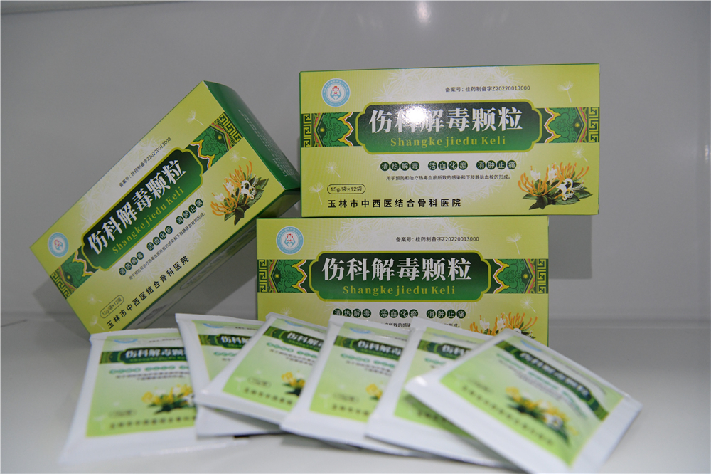 该方来源于我院临床协定方,具有清热解毒,活血化瘀,消肿止痛的功效,主要用于预防和治疗热毒血瘀所致的感染和下肢静脉血栓的形成。经近十年的临床验证,能有效控制骨伤科感染,防治静脉血栓,对治疗外伤、骨折及术后早期的红肿热痛有良好效果,能有效缓解骨折引起的疼痛,深受医务人员及患者的信赖和好评。为了优化传统剂型,根据《广西医疗机构应用传统工艺配制中药民族药制剂备案管理实施细则》的规定,我院制剂室组织有关科研人员,将该方改良为颗粒剂,既保证了药物的疗效和质量稳定,又解决了中药汤剂口感不佳、煎煮麻烦、患者等待时间久和难储存等问题,大大方便了患者。