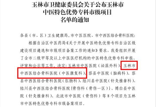 近日,玉林市卫生健康委员会公布了一批中医特色优势专科的入选名单,我院康复医学科(疼痛科)获评!一直以来,我院领导高度重视中医特色专科发展,坚持中西合璧,协同并进,大力扶持和鼓励中医特色项目开展。此次入选,不仅是对我院中医康复专项工作的充分肯定,也对今后我院进一步拓展专科服务广度和深度、提升学科建设能力提出了更高的要求。