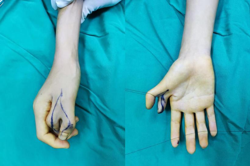 术前DR检查了解骨性结构,通常需要检查畸形指的正侧位,同样也要检查正常手对应指的正侧位,术前通过测量畸形指及正常拇指外观和指骨的直径、甲床的宽度等,通过测量数据分析设计切口及截骨量。