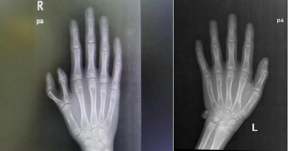 男孩姓叶,13岁,比同龄人瘦小,因患有先天性食管闭锁而行手术治疗,之后十年免疫力低下,经常发热,反复肺炎,先天性右手拇指多指畸形的治疗虽曾多方就诊,但断断续续,没有得到有效救治。随着年龄的增长,男孩的右拇指畸形也更加明显,呈蟹钳样,在学校经常被同学嘲笑,性格也随之受到影响,家属认为再也不能耽搁了,于是在网上查询大量的相关资料,对比各大医院治疗效果之后,最终选择到玉林市中西医结合骨科医院进行治疗。