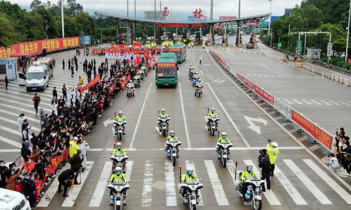 英雄回家,玉林交警以最高礼遇迎接支援湖北白衣战士凯旋归来(蒋金泰 摄 )