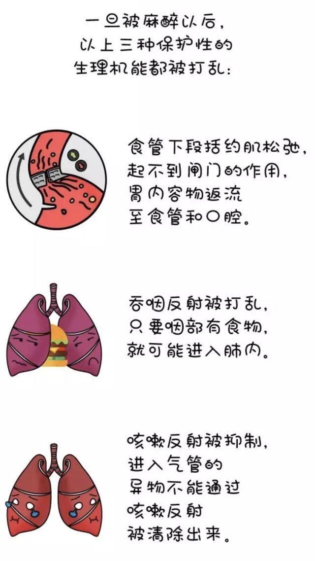 在麻醉情况下三位“守卫兵”就会失去保护作用,如果此时胃里有食物或水残留时,食管下括约肌松弛,食物反流进入口咽部;无法进行吞咽动作,会厌无法关闭,食物进入气道;无法进行咳嗽,不能清除异物,食物持续堵塞气道,引起窒息或肺部感染。术前患者要禁食禁饮是规定要求,为了手术能够顺利进行不能心存侥幸贪一时嘴馋。