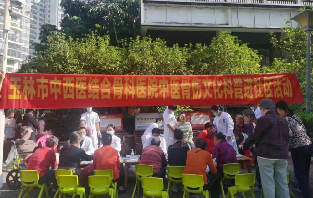 弘扬中医药文化,传承国粹经典,我们任重道远。作为广西科普教育基地,玉林市中西医结合骨科医院继玉东新区实验小学、福绵区樟木镇第二中心小学、茂林镇陂石小学等中医药文化进校园活动之后,进一步推行中医药文化进社区义诊活动,先后到东秀社区、石棠社区、富林金桂丽湾小区进行义诊,通过内容丰富,形式多样的活动形式,让广大市民朋友零距离接触中医药文化,增强市民对中医药文化自信感与认同感。我院将继续深入挖掘中医药文化内涵,守正创新,以医化人,做中医药文化的传承者和弘扬者,为健康中国建设助力。