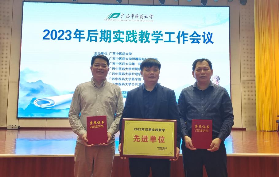 此次会议,我院再次获得“广西中医药大学后期实践教学先进单位”,这也是我院连续2次获此殊荣;医务科负责人梁周获得先进管理个人,朱博副主任医师、周烈超副主任医师、宁运乾副主任医师获得优秀带教教师荣誉称号。