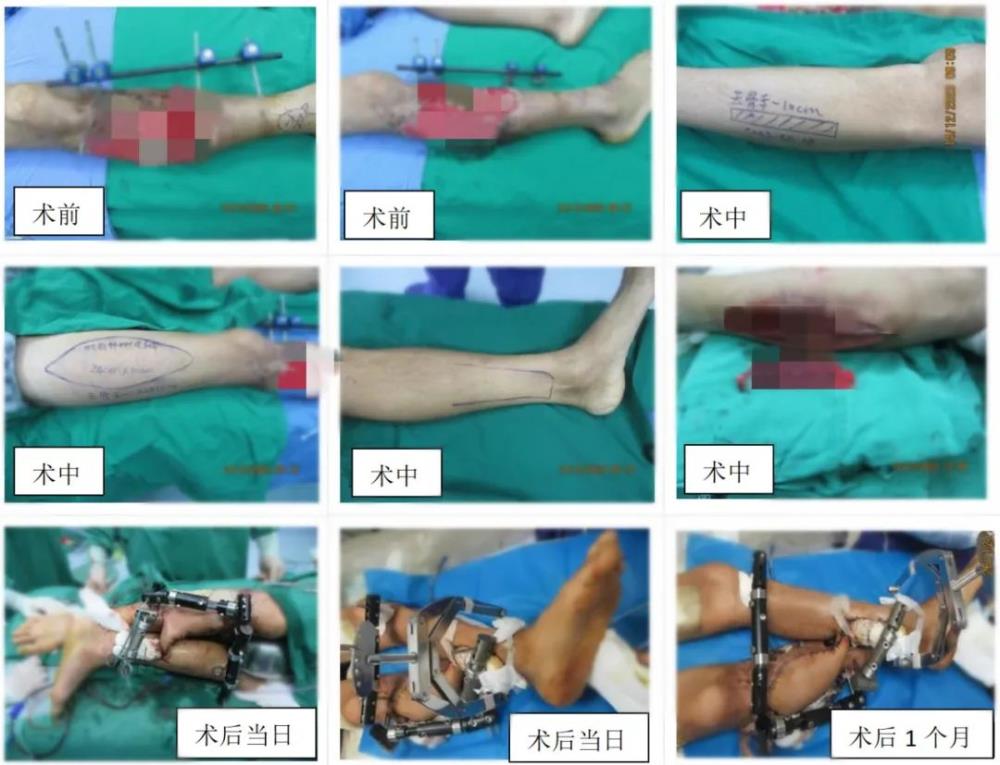 两个月前,30多岁的吴先生因在工地上班时意外被树木砸伤,导致右侧胫骨开放性粉碎性骨折并皮肤软组织开放脱套伤,正是家里顶梁柱的他生怕就此变成残疾,为了尽快康复,吴先生慕名来到我院手外一科就医,经检查发现其右小腿大面积皮肤软组织缺损(25*28cm)、肌群缺损(小腿外侧),创面大量脓液形成,拍片提示其存在长段骨缺损(8cm),右侧足踝关节不能背伸等。经评估,手外一科陈仕平主任组织全科医务人员讨论,最终给吴先生确定了行游离对侧腓骨瓣移植修复、取皮植皮术治疗方案,并在手术后创新性地采用左侧胫骨远端骨牵引,以减少交腿皮肤压疮形成的风险。