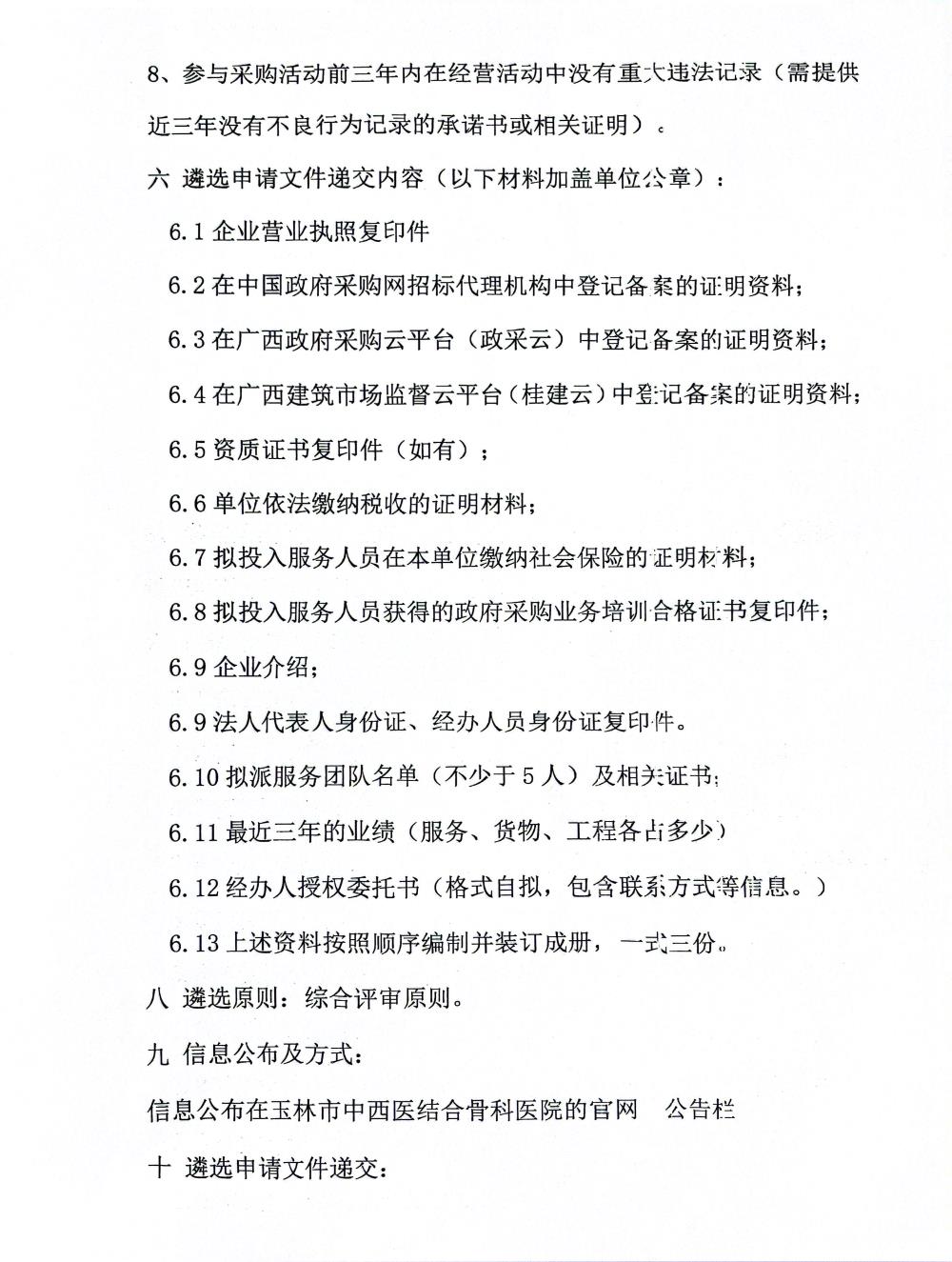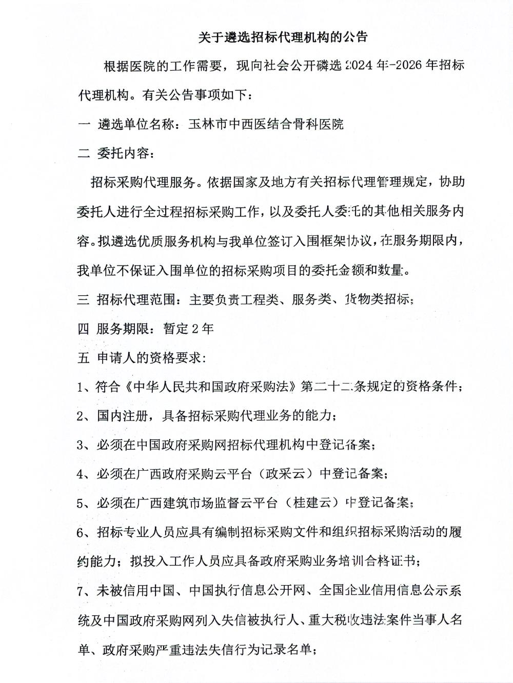 关于公开遴选玉林市中西医结合骨科医院招标代理机构的公告