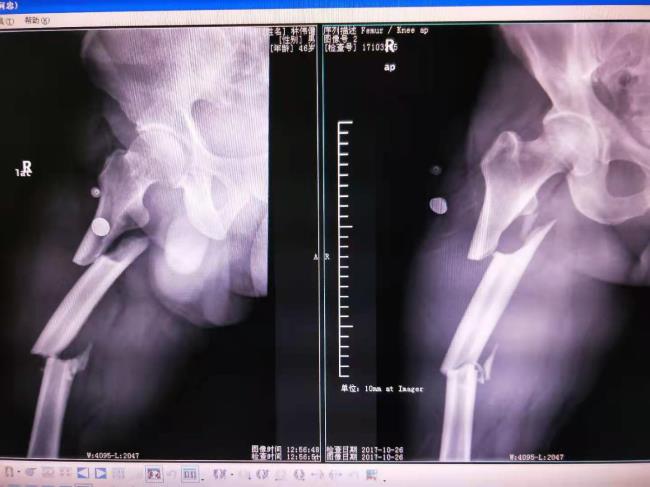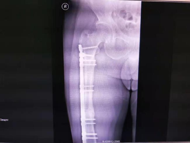 病例1、右股骨多段粉碎性骨折治前及治疗后X线片