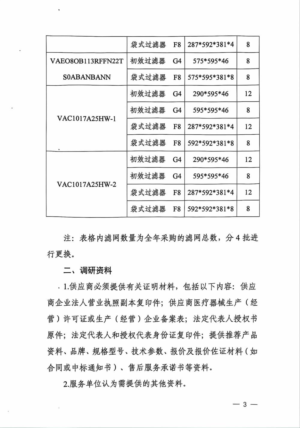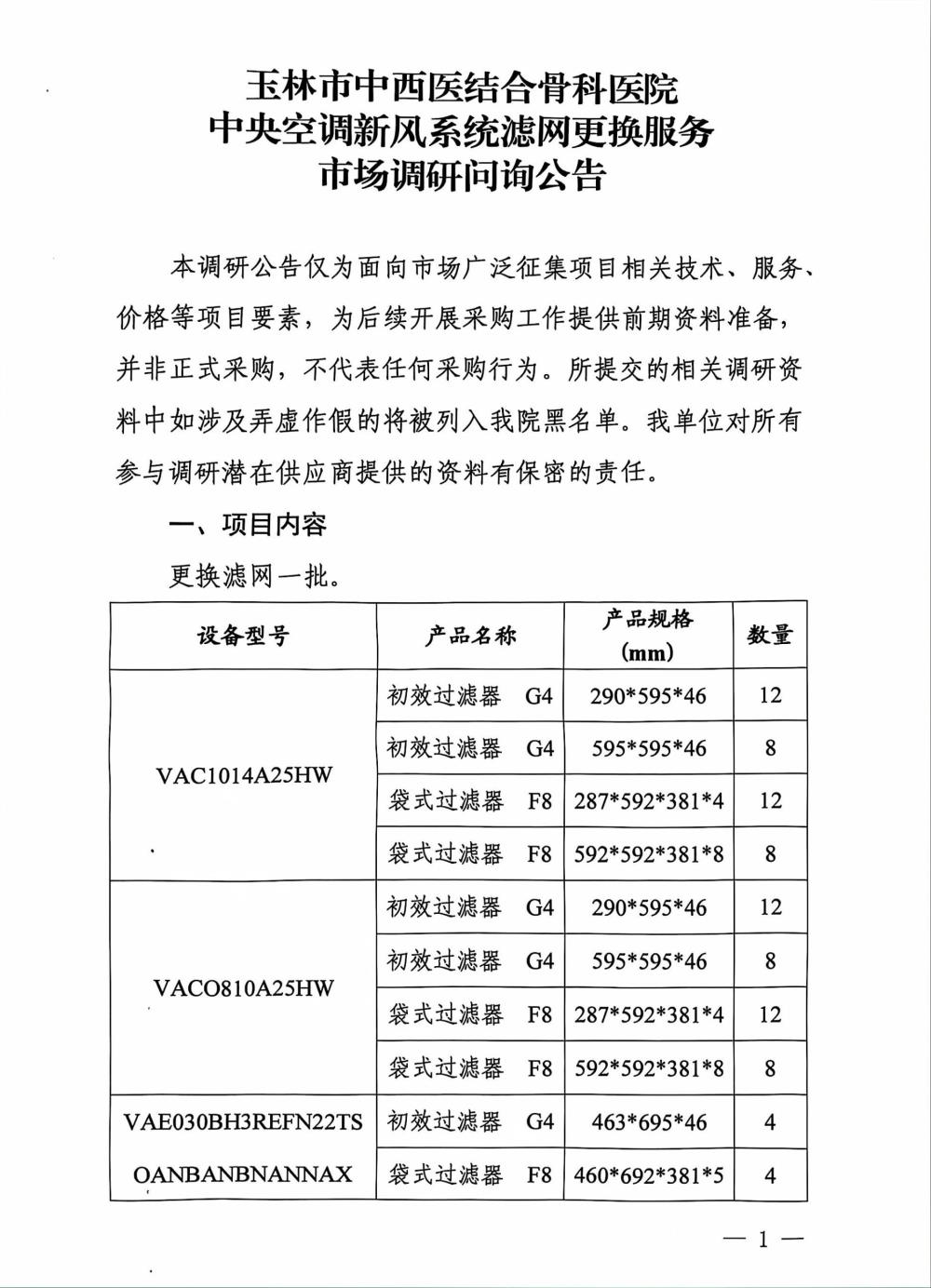 玉林市中西医结合骨科医院中央空调新风系统滤网更换服务市场调研问询公告
